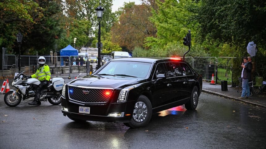 "The Beast" armored limousine departs from Winfield House, the U.S. Ambassador's residence, during the state visit of US President Donald…