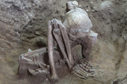 Left: The remains of a middle-aged woman at the Liyupo site in…